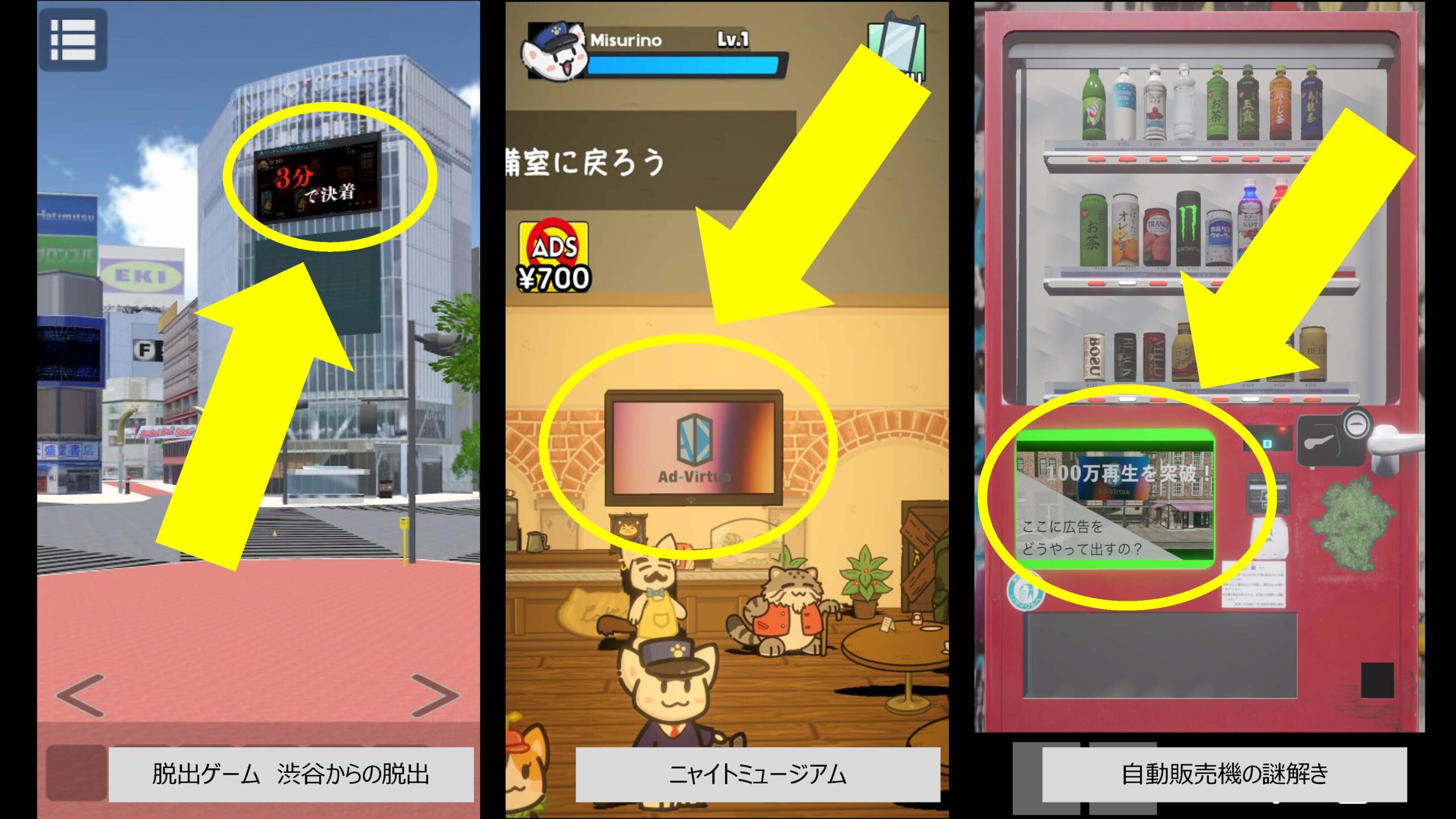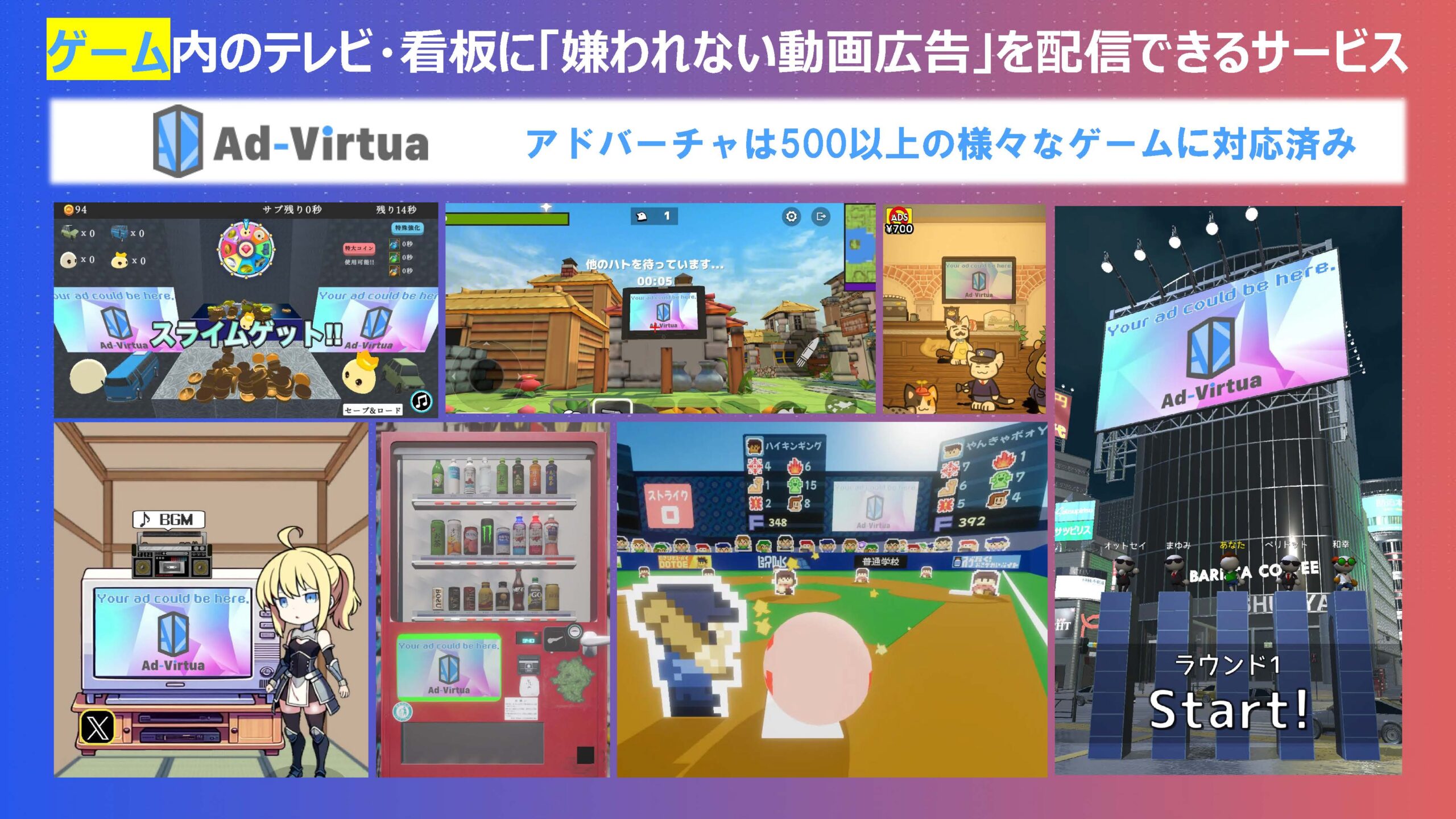 このようにゲーム内のテレビや看板の中に動画広告を出稿できるサービスが「Ad-Virtua」です。スマホ、PC、VRに対応しています。