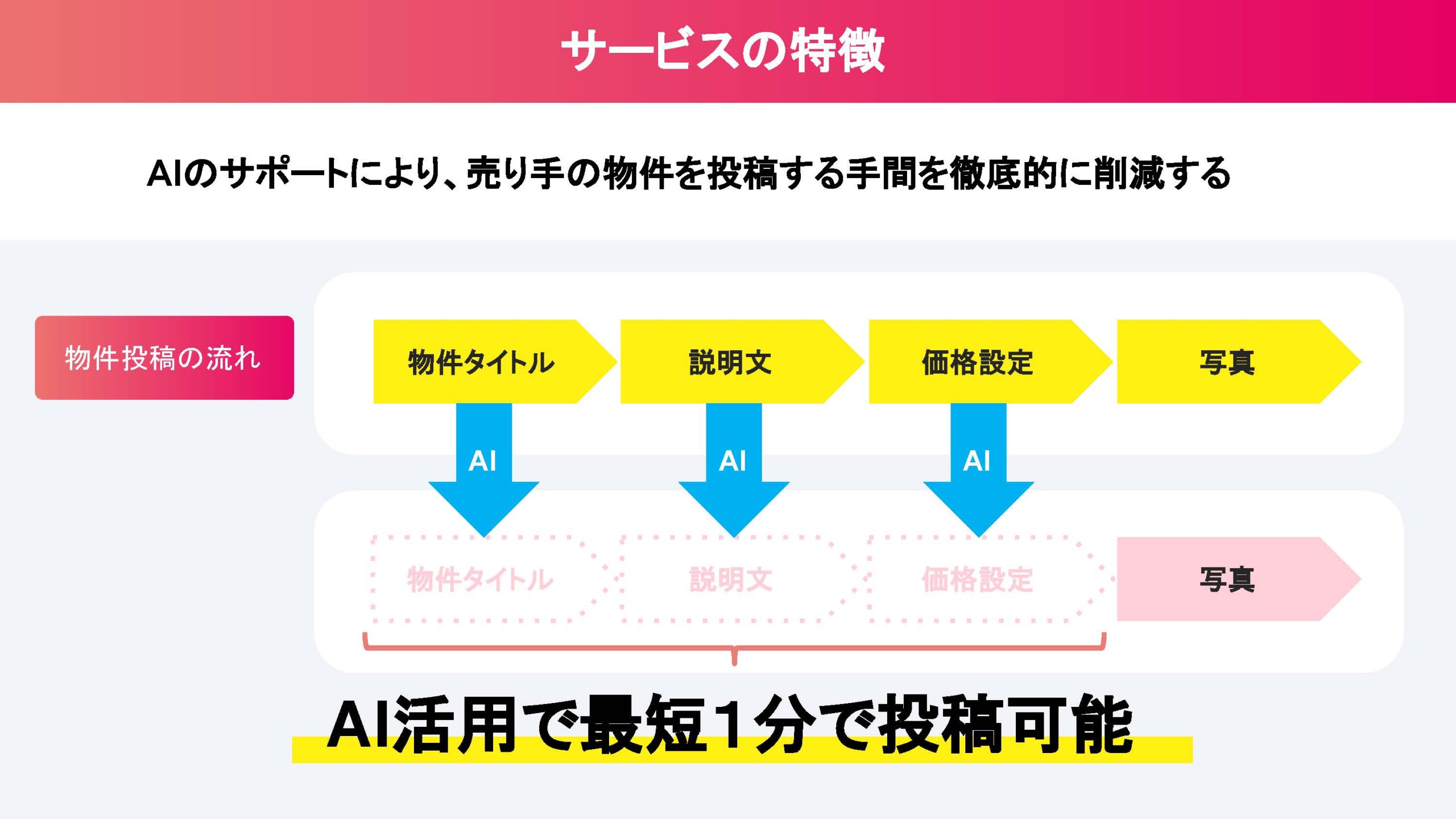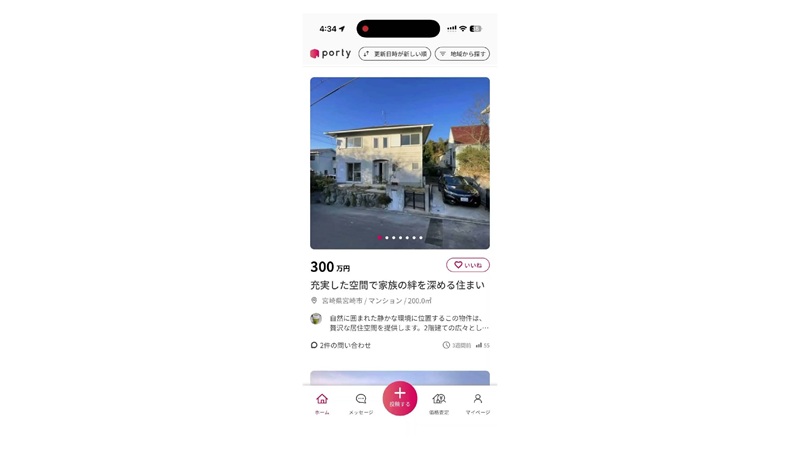 物件を投稿する画面で画像を入力すると、画像情報をAIが読み取って物件のタイトル付けや物件説明を生成。物件の住所情報を入力したら、周辺の環境情報や施設情報もAIが自動で生成します。希望金額を入力して、「投稿する」ボタンを押せば、掲載は完了。一方の買い手は売主にアプリから直接「内見できますか?」「建物の状態はどうですか?」といったメッセージを送り、やりとりを進めます。